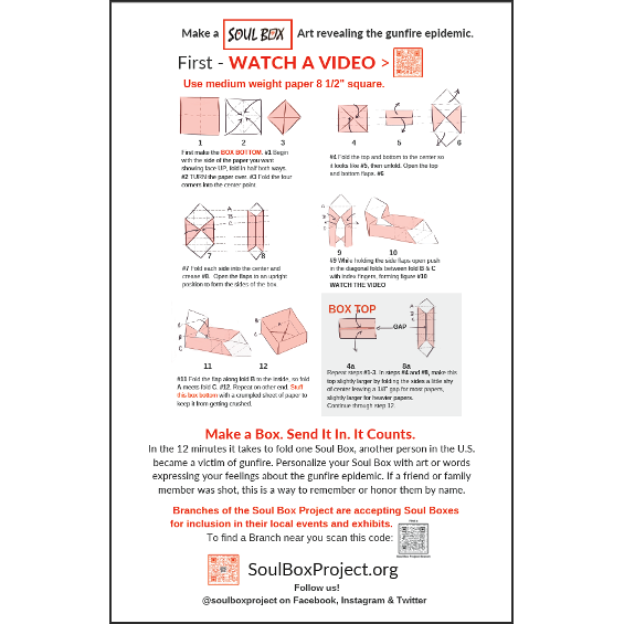 If you are hosting a Soul Box-folding activity or including a table in your exhibit space, you may play the video in a loop or place a print-out into a plexi sign holder. Include paper cut to 8.5 x 8.5 square and optional felt markers, glue stick, or other materials to personalize Soul Boxes.